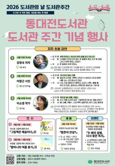 이번 행사는 ‘도서관 속 작은 펼침, 세상을 여는 큰 열림’을 슬로건으로, 4월 4일부터 26일까지 동대전도서관 1층 로비와 전시실, 청소년창작실 등에서 진행된다.