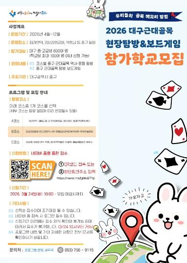 [한국제일신문, 김성옥기자] 대구 중구는 3월부터 지역 청소년들이 우리 지역의 역사와 문화를 친숙하고 재미있게 체험할 수 있는 2026년 근대골목 보드게임 탐방 프로그램을 운영한다.