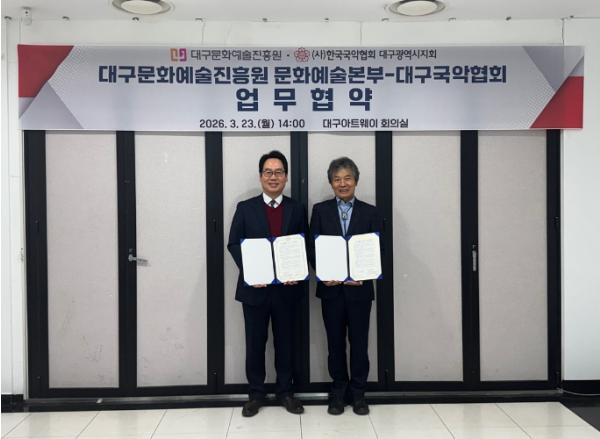 [한국제일신문, 김성옥기자] 대구문화예술진흥원 문화예술본부과 대구국악협회가 3월 23일 업무협약을 체결했다.