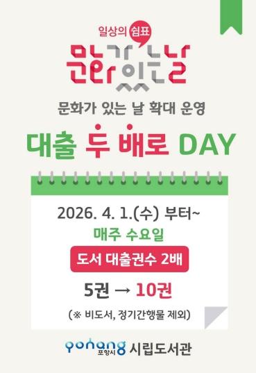 다만 ‘대출 두배로데이’는 일반 도서에 한해 적용되며, 비도서 자료와 정기간행물은 기존과 동일하게 대출 제한 규정이 유지된다.