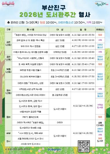 행사 참여는 온라인 신청 및 현장 참여로 가능하며, 사전 온라인 신청이 필요한 프로그램은 3월 26일부터 부산진구 통합도서관 홈페이지에서 도서관별로 순차 접수할 예정이다.