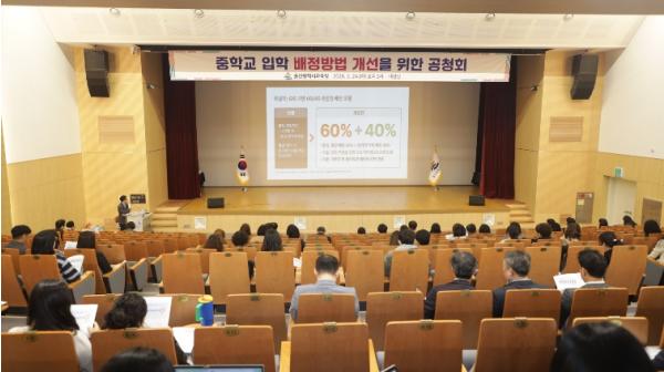 이번 공청회는 이달 초 마련된 중학교 입학 배정 개선안을 설명하고, 교육공동체의 다양한 의견을 듣고자 마련됐다. 현장에는 학부모와 교직원 150여 명이 참석해 높은 관심을 보였다.