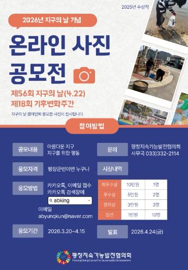 접수 기간은 4월 15일까지이며, 응모 방법은 사진 파일을 이메일이나 카카오톡 메시지로 제출하면 된다. 응모작은 1차 심사를 거쳐 4월 22일 ‘평창에코랜드’에서 열리는 지구의 날 캠페인 행사장 내 전시될 예정이며, 우수작에는 소정의 상금이 지급된다.