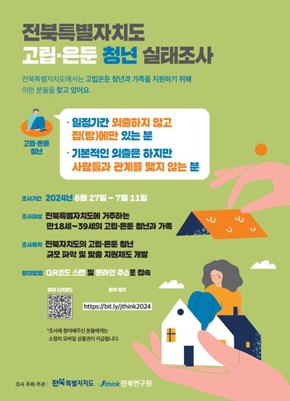조사대상은 전북자치도에 거주하며 3개월 이상 외출하지 않고 집에서 생활하는 고립은둔 청년으로, 현재 은둔생활을 하고 있거나 과거 은둔경험이 있는 18세에서 39세까지의 청년과 그 가족이다. 조사에 대한 접근성을 높이기 위해 온라인으로 진행하며 QR코드 또는 링크(bit.ly/jthink2024) 접속을 통해 조사에 참여할 수 있도록 설계됐다.