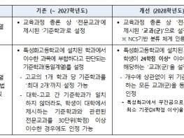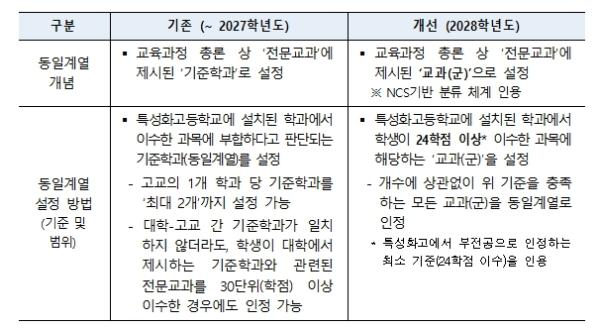 〇 기존(~2027학년도 기본사항)에는 각 시·도교육청에서 제공하는 ‘특성화고교 학과별 기준학과’(초중등교육과정 총론을 따름) 정보를 토대로 대학의 학과(전공)와의 동일계열 여부를 심사했으나, 최근 특성화고교의 학과 운영 방식의 변화, 2022 개정 교육과정 도입 등으로, 기존의 기준학과 설정을 통한 동일계열 인정 방식의 한계 발생