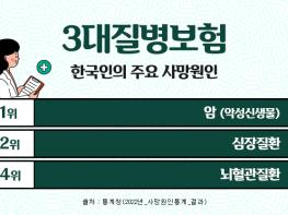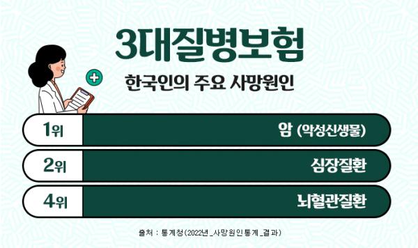 [한국제일신문, 김성옥기자] 한국인의 주요 사망원인중에 암, 뇌혈관질환, 심혈관질환은 흔히 3대질병이라 일컬어지며 살아가면서 가장 먼저 대비해야 하는 중대질병으로 항상 강조되고 있다. 이들 질병에 미리 대비하기 위해 가입하는 것이 진단비보험인데, 이러한 3대질병진단비를 중점으로 보장하는 보장성보험이 3대진단비보험 이다. 3대질병진단비보험은 각각의 질병에 주목해서 보장하기도 하지만, 나에게 맞는 추가 특약을 잘 골라서 가입한다면 종합건강보험으로도 충분히 활용도가 높다.