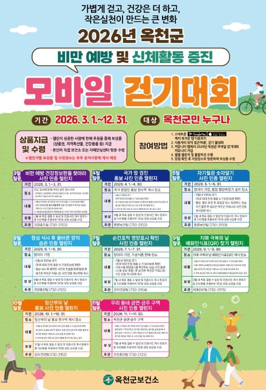 [한국제일신문, 김성옥기자] 옥천군보건소는 지역주민의 일상 속 걷기 실천율을 높이고 건강증진을 도모하기 위해 ‘2026년 옥천군 모바일 걷기대회’ 커뮤니티를 운영한다고 밝혔다.