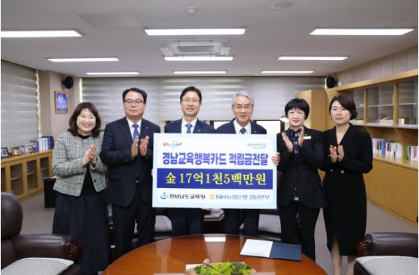 [한국제일신문, 김성옥기자] 경상남도교육청은 24일 NH농협은행으로부터 ‘경남교육행복카드’ 사용으로 적립된 포인트 17억 1,585만 6,930원을 전달받았다.