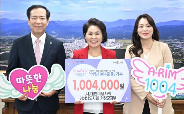 [한국제일신문, 김성옥기자] 거창군은 지난 24일 (사)대한미용사회 경상남도지회 거창군지부(지부장 구희자)가 지역내어려운 이웃을 돕기 위한 성금 100만 4천 원을 아림1004운동에 기부했다고 밝혔다.