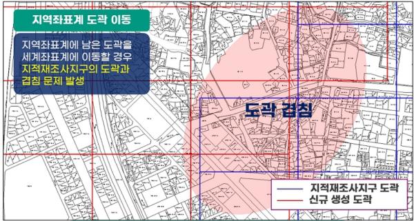 사업은 수치지역의 경우 세계측지계 좌표에 맞는 도곽을 새로 생성하고, 도해지역은 좌표 오류를 정비하는 방식으로 추진되며, 도곽 위치 변동에 따른 필지 속성 정보도 함께 정비할 계획이다.