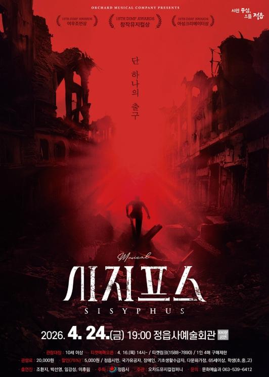 [한국제일신문, 이미란기자] 정읍시가 시민들에게 수준 높은 문화 향유 기회를 제공하기 위해, 오는 24일 오후 7시 정읍사예술회관에서 창작 음악극(뮤지컬) ‘시지프스’를 무대에 올린다.